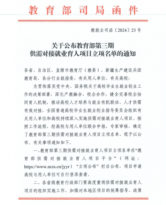 教育部高校学生司自2021年起持续开展供需对接就业育人项目,目前已经进行到第三期。第三期供需对接就业育人项目分为就业实习基地项目、定向人才培养培训项目、人力资源提升项目、重点领域校企合作项目、重点群体就业帮扶项目五类。教育部供需对接就业育人项目旨在深入贯彻党中央、国务院关于促进高校毕业生就业创业的战略部署,通过深化产教融合与校企合作,实现人才培养与就业市场的紧密衔接,有效对接人才供需,进而推动人才培养与就业工作的有机结合和协同发展。