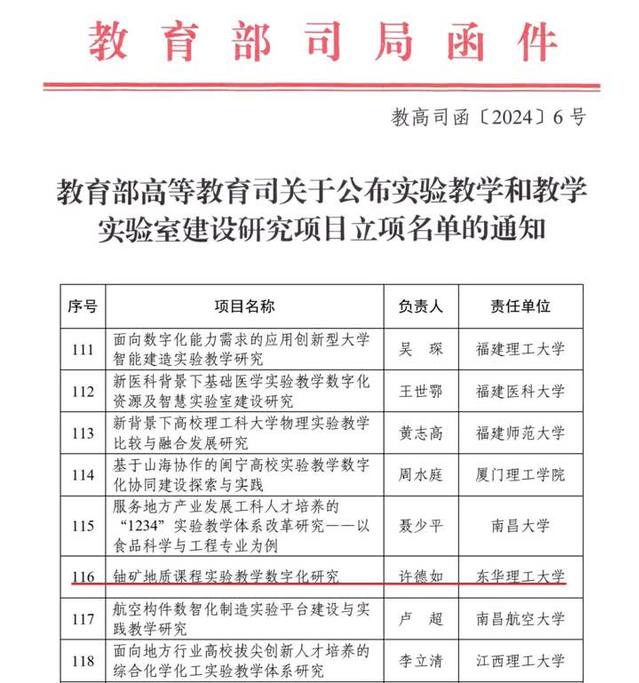 近日,教育部高等教育司下发了《教育部高等教育司关于公布实验教学和教学实验室建设研究项目立项名单的通知》(教高司函〔2024〕6号),雷速网页版地球科学学院许德如教授团队申报的“铀矿地质课程实验教学数字化研究”项目获批立项。