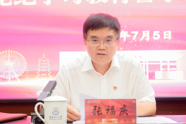 张福庆传达学习了习近平总书记关于全面加强党的纪律建设的重要论述。他强调,全校各级党组织和广大党员干部要深刻认识开展警示教育的重要意义,聚焦《中国共产党纪律处分条例》,严明纪律规矩,自觉用“六项纪律”校正思想和行动。一要严守政治纪律,永葆绝对忠诚。要始终在严守党的政治纪律和政治规矩上做到标准更高、要求更严,在任何困难面前都能坚定理想信念,确保党的路线、方针、政策、决议和国家法律法规在学校贯彻到位。二要严守组织纪律,强化组织观念。要严格执行民主集中制,坚持求真务实,按党规党纪办事、按政策规定办事、按组织原则办事,不断提高科学决策、民主决策、依法决策水平。党员干部要自觉坚持党性原则,将组织纪律内化为自身的言行准则。三要严守廉洁纪律,筑牢思想堤坝。要树牢规矩意识,坚守廉洁底线,始终保持清醒认识,强化自我警醒和自我约束,时刻把法律的戒尺、纪律的戒尺、制度的戒尺牢记于心,慎独慎微慎初,不越“雷池”、不踩“红线”、不破“底线”。四要严守群众纪律,站稳人民立场。要坚持树牢为民造福的正确政绩观,把维护师生利益的事做到实处。围绕事关师生切身利益的日常工作和师生急难愁盼问题,要坚持以师生为中心,积极破题攻坚,切实把实事办好办实,不断提升师生的获得感、幸福感和安全感。五要严守工作纪律,强化责任意识。要坚持刀刃向内,勇于自我革命,进一步转作风、树新风,埋头苦干、勇毅前行,勤于学习借鉴“破题”,善于创新方法“破冰”,敢于抢位错位“破局”,真正做到干就干成一流、做就做到最好,接好学校高质量发展“接力棒”。六要严守生活纪律,锤炼道德品行。要严格约束自身的操守和行为,自觉净化社交圈、生活圈、朋友圈,做到八小时内外言行一致,持之以恒锤炼品德修为,带头强化言传身教,注重家庭家教家风建设,树立党员干部的良好形象。
