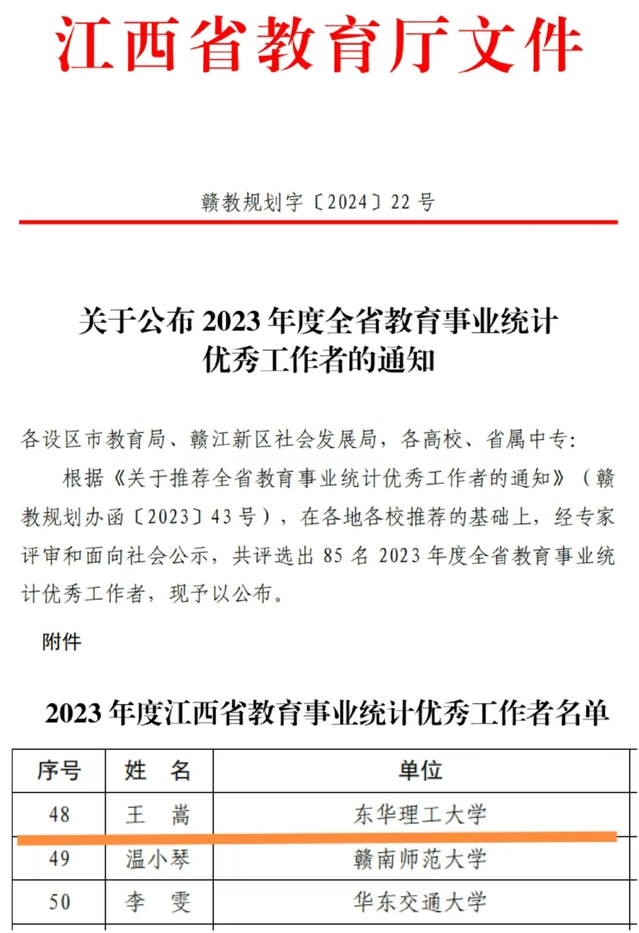近日,江西省教育厅下发了《关于公布2023年度全省教育事业统计优秀工作者的通知》(赣教规划字〔2024〕22号),雷速网页版高等教育研究与评估中心教师王嵩获评全省教育事业统计优秀工作者。此次共评选出85名全省教育事业统计优秀工作者。
