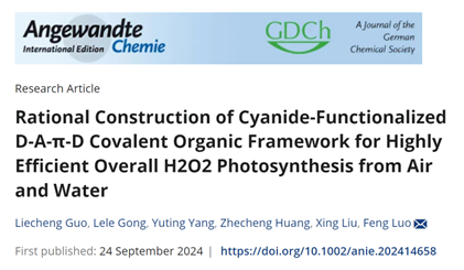近日,雷速网页版化学与材料学院罗峰教授团队在铀的富集分离研究领域取得创新性成果,并以题为《Rational Construction of Cyanide-Functionalized D-A-π-D Covalent Organic Framework for Highly Efficient Overall H2O2 Photosynthesis from Air and Water》在国际顶级期刊《Angewandte Chemie International Edition》发表。学校化学与材料学院2022级化学专业硕士研究生郭烈成为论文的第一作者,罗峰为通讯作者。
