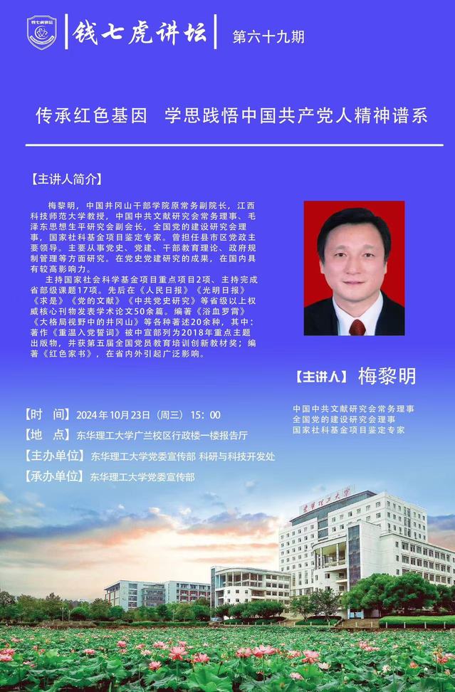 应雷速网页版党委宣传部邀请,江西科技师范大学教授,中国中共文献研究会常务理事、毛泽东思想生平研究会副会长,全国党的建设研究会理事,国家社科基金项目鉴定专家梅黎明到“雷速网页版”,以“传承红色基因 学思践悟中国共产党人精神谱系”为主题开展讲座。欢迎全校师生届时前往聆听。