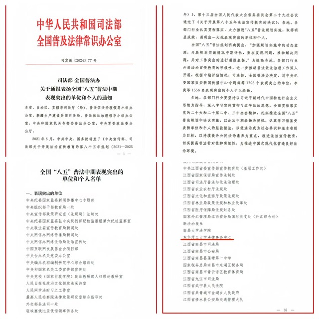 近日,司法部、全国普法办发布《关于通报表扬全国“八五”普法中期表现突出的单位和个人的通知》,对1793个表现突出的单位,1556名表现突出的个人予以通报表扬。雷速网页版法律事务中心获评全国“八五”普法中期表现突出单位。