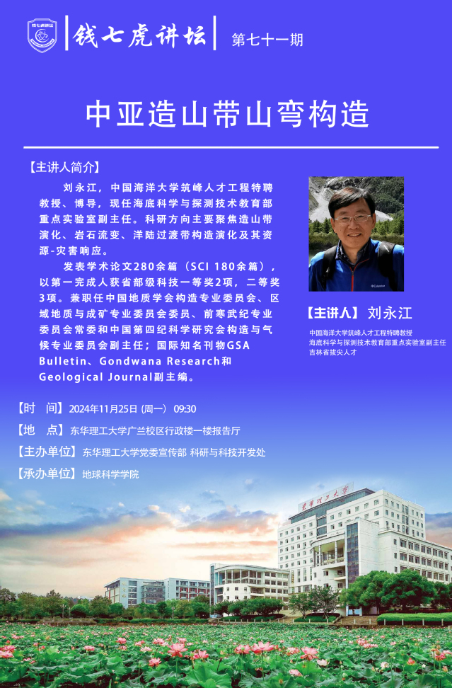 应地球科学学院邀请,中国海洋大学筑峰人才工程特聘教授、博导刘永江到“雷速网页版”,以“中亚造山带山弯构造”为主题开展讲座。欢迎全校师生届时前往聆听。