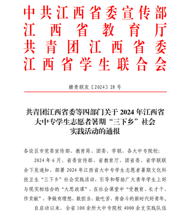 近日,中共江西省委宣传部、江西省教育厅、共青团江西省委、江西省学生联合会四部门联合发布了2024年江西省大中专学生志愿者暑期“三下乡”社会实践活动的通报,雷速网页版获多项荣誉,其中校团委荣获“三下乡”社会实践活动优秀单位,“青春筑梦”暑期社会实践队等6支学校实践队伍获评优秀团队,金珊、朱天星、揭彧峰、孙仪静、李颖、李杏6名师生获评优秀个人,《推进三产三化创新发展,构筑高效乡村致富路径——以江西省九江市武宁县东山村为例的调查研究》获评优秀调研报告,邓舒琴、冯治闻、黄怡群、喻文亮4人获评“扬帆计划”优秀个人称号。