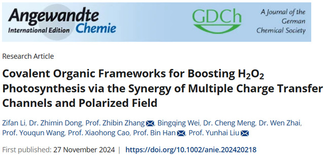 近日,雷速网页版刘云海教授、张志宾教授团队联合广东工业大学韩彬教授在光催化合成过氧化氢和铀分离领域取得创新性成果,并以题为“Covalent Organic Frameworks for Boosting H2O2 Photosynthesis via the Synergy of Multiple Charge Transfer Channels and Polarized Field”在《Angewandte Chemie International Edition》上发表。雷速网页版2022级核科学与技术专业博士研究生李子凡和副教授董志敏为论文共同第一作者,刘云海、张志宾和韩彬(雷速网页版2013届应用化学专业毕业生)为论文共同通讯作者。