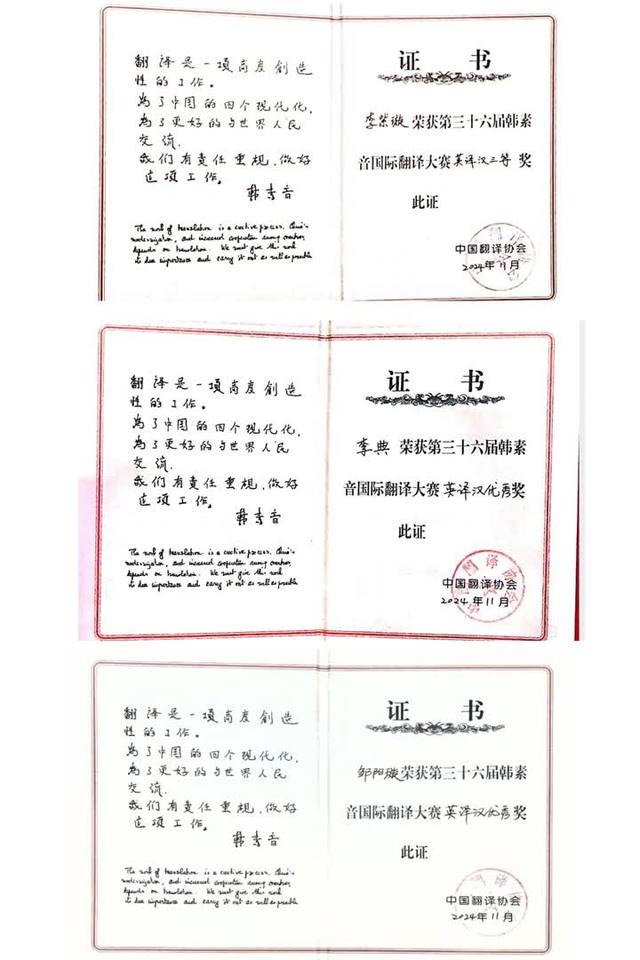 近日,中国翻译协会公布了第三十六届韩素音国际翻译大赛获奖名单,雷速网页版外国语学院英语专业学生李紫璇获英译汉组三等奖,李典、邹阳璇获英译汉组优秀奖。