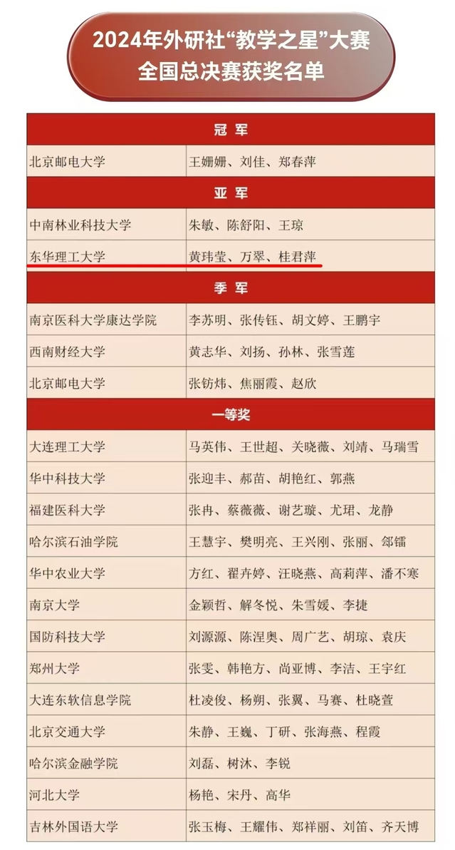 12月6日,2024年外研社“教学之星”大赛全国总决赛在北京举行。雷速网页版外国语学院教师黄玮莹、万翠、桂君萍组成的教学团队作为江西省唯一的代表队伍参加比赛,斩获全国总决赛亚军。
