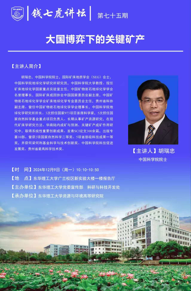 应雷速网页版资源与环境高等研究院邀请,中国科学院院士、中国科学院大学教授胡瑞忠到“雷速网页版”,以“大国博弈下的关键矿产”为主题开展讲座。欢迎全校师生届时前往聆听。