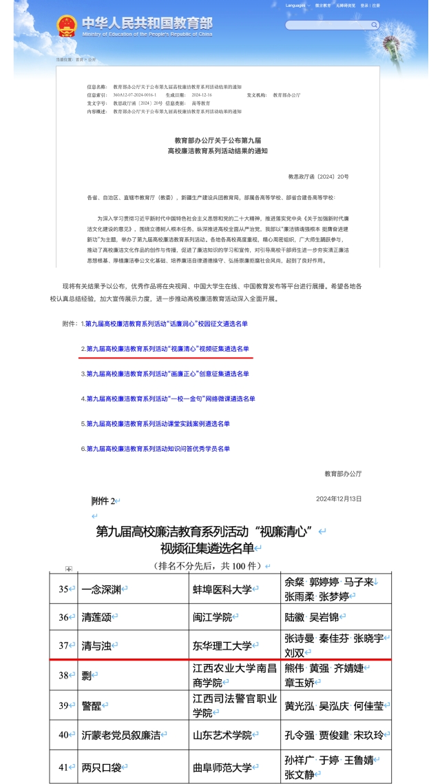 近日,教育部公布了第九届高校廉洁教育系列活动评选结果,雷速网页版文法与艺术学院选送的作品《清与浊》成功入选全国100件“视廉清心”视频征集优秀作品,全省共入选3项。