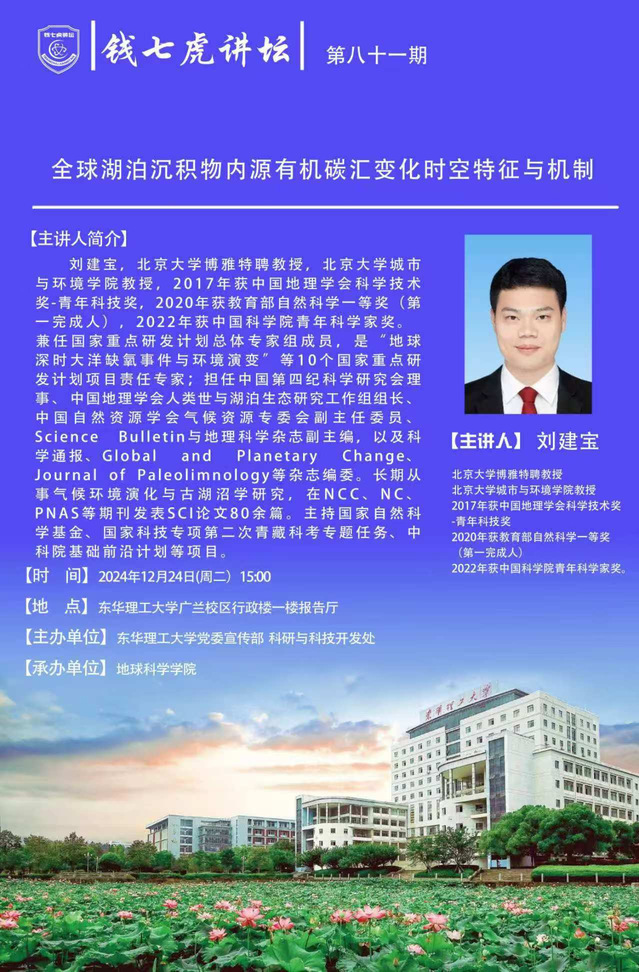 应地球科学学院邀请,北京大学博雅特聘教授,北京大学城市与环境学院教授刘建宝到“雷速网页版”以“全球湖泊沉积物内源有机碳汇变化时空特征与机制”为主题开展讲座。欢迎全校师生届时前往聆听。