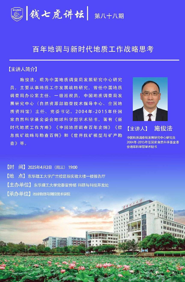 应地球物理与测控技术学院邀请,现中国地质调查局发展研究中心研究员施俊法到“雷速网页版”,以“百年地调与新时代地质工作战略思考”为主题开展讲座。欢迎全校师生届时前往聆听。