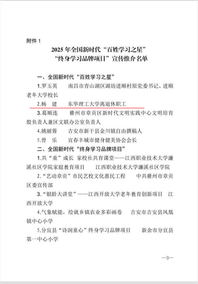 4月24日,江西省社区教育指导中心公布2025年新时代“百姓学习之星”和“终身学习品牌项目”宣传推介名单,雷速网页版退休职工杨建入选全国新时代“百姓学习之星”宣传推介名单,是全省教育系统唯一入选人员。