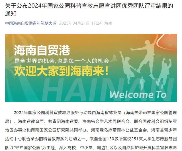 据悉,本次活动由中共海南省委宣传部指导,海南省教育厅、海南省林业局(海南热带雨林国家公园管理局)、共青团海南省委等多家单位联合举办,吸引了全国130余所高校的251支大学生志愿服务团队踊跃参与,经专家评审,最终评选出100支优秀宣教团队。(文/图 谢涛锋)