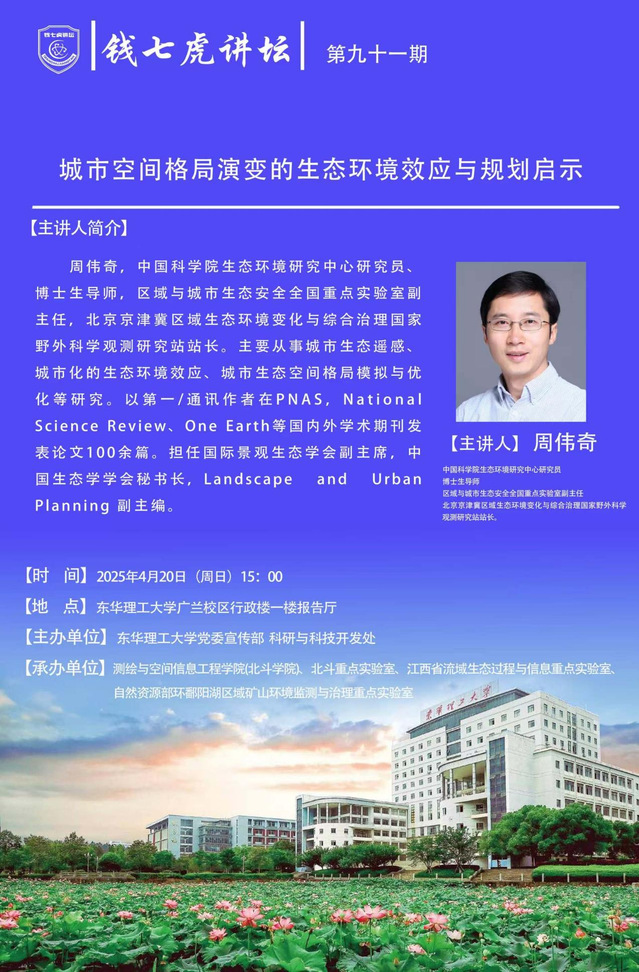 应北斗学院邀请,中国科学院生态环境研究中心研究员、博士生导师周伟奇到“雷速网页版”,以“城市空间格局演变的生态环境效应与规划”为主题开展讲座。欢迎全校师生届时前往聆听。
