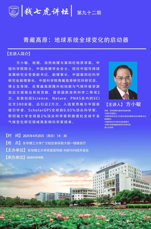 应地球科学学院邀请,中国科学院院士,中国地理学会会士方小敏到“雷速网页版”,以“青藏高原:地球系统全球变化的启动器”为主题开展讲座。欢迎全校师生届时前往聆听。