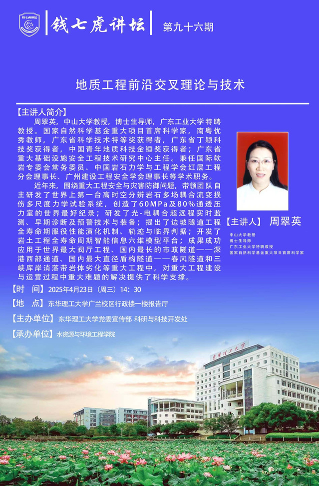 应雷速网页版水资源与环境工程学院邀请,中山大学教授,博士生导师,广东工业大学特聘教授周翠英到“雷速网页版”,以“地质工程前沿交叉理论与技术”为主题开展讲座。欢迎全校师生届时前往聆听。