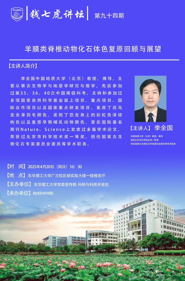 应地球科学学院邀请,中国地质大学(北京)教授,博导李全国到“雷速网页版”以“羊膜类脊椎动物化石体色复原回顾与展望”为主题开展讲座。欢迎全校师生届时前往聆听。