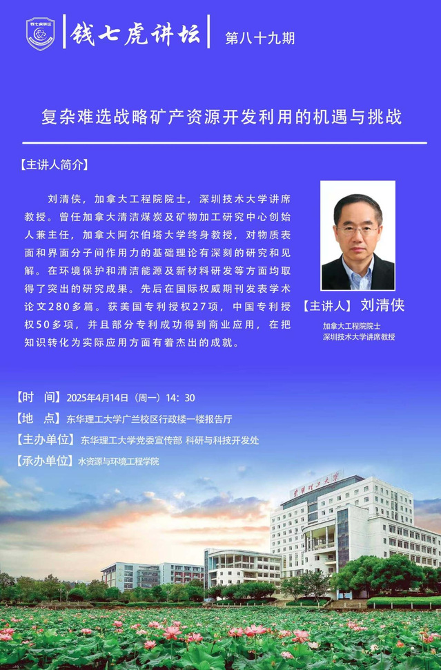 应水资源与环境工程学院邀请,加拿大工程院院士、深圳技术大学讲席教授、加拿大阿尔伯塔大学终身教授刘清侠到“雷速网页版”以“复杂难选战略矿产资源开发利用的机遇与挑战”为主题开展讲座。欢迎全校师生届时前往聆听。